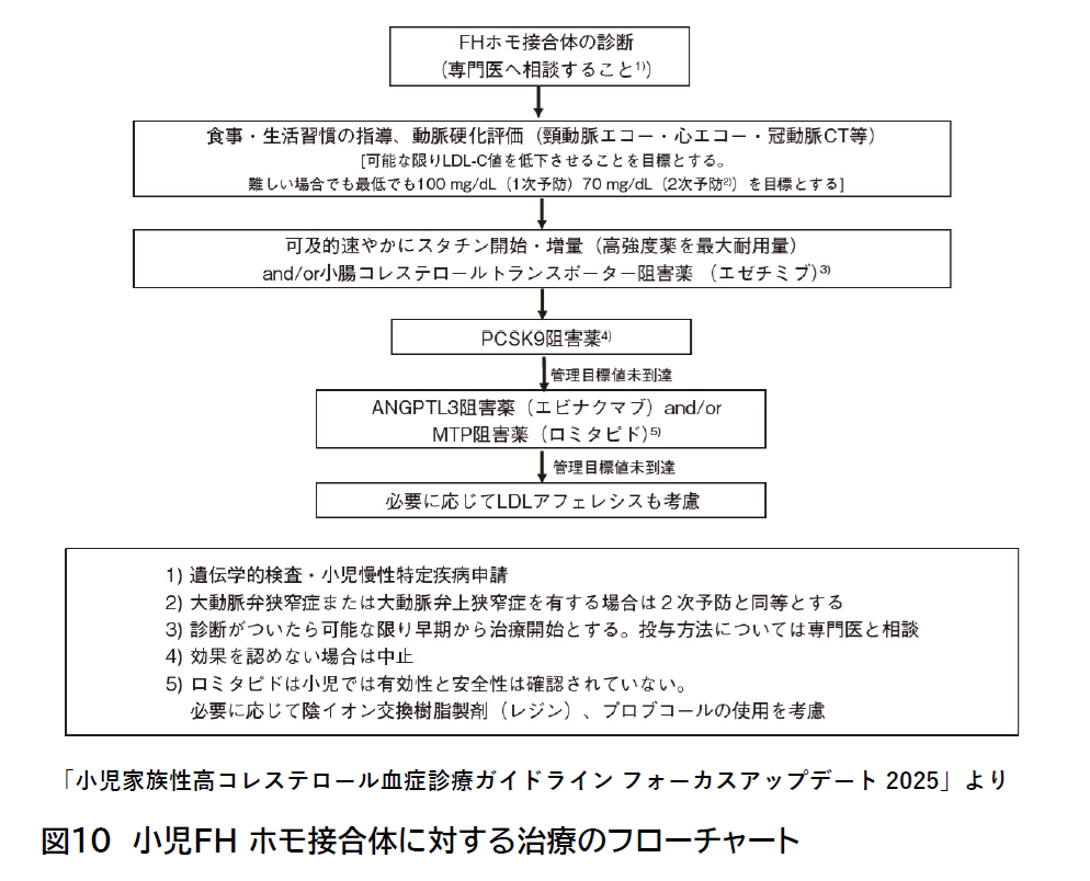 FHの治療の基本は、動脈硬化症の発症および進展の予防であり、早期診断と厳格な治療が最も重要です。生来からの著明な高LDL-C血症は蓄積効果となり、動脈硬化進展に関連するとされており、FHは出来るだけ早期に診断を下し、低脂肪食などの正しい食生活を子供時代から身につけると同時に、喫煙、肥満などの動脈硬化症の危険因子をしっかりと避け、高血圧や糖尿病を厳格にコントロールすることが必要です。しかしながら、生活習慣の改善のみでは、LDL-C値を安全域まで充分に低下させることは困難な場合が多く、薬物治療を行います。また、LDL-C以外のリスクを厳格にコントロールすることも重要です。成人(15歳以上)ヘテロ接合体性FHの治療チャートを図7に示し、小児(15歳未満)ヘテロ接合体性FHの治療チャートを図8に示します。重要な点はヘテロ接合体性FHにおいては10歳以上でLDL-C値が繰り返し180mg/dLを超えるようなら薬物治療の適応があるということです。なお、スタチンを基本薬剤とし他剤併用も考慮しLDL-C管理目標値を目指します。また、ホモ接合体性FHの治療チャートを図9、図10に示します。ホモ接合体性FHの診断および治療は必ず専門医に相談してください。