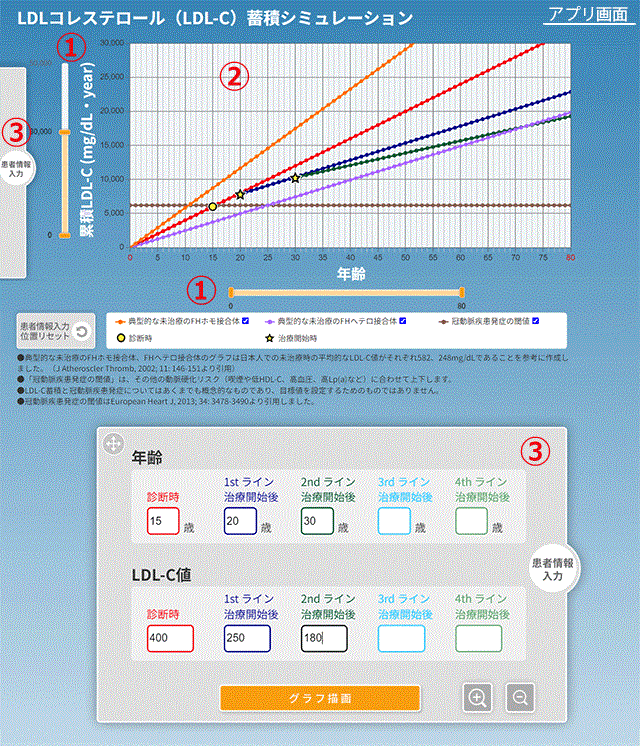 近年、冠動脈発症に関してLDL-C蓄積仮説が提唱されるようになって参りました。特に家族性高コレステロール血症(FH)については生来の高LDL-C血症に暴露されることでそのリスクが高まっていると考えられております。このような背景から診断時および治療中のLDL-C値を基にLDL-C蓄積をシミュレーションできるアプリケーションを作成いたしました。